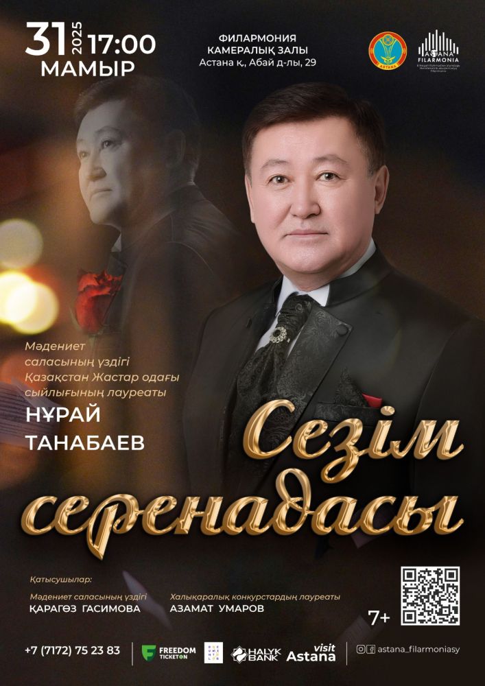 2025 жылғы 31 мамырда сағат 17:00-де Астана қаласы филармониясының Камералық залында (Абай даңғылы, 29) “Сезім серенадасы” атты ән кеші өтеді.Кеш иесі — Нұрай Танабаев, Қазақстан Жастар одағы сыйлығының лауреаты, мәдениет саласының үздігі.Кеш барысында көрермендерге шынайы сезімге толы сырлы әндер, жүрекке жылы әуендер ұсынылады. Қазақ музыкасының көркемдігін паш ететін бұл кеш — нағыз өнер сүйер қауымға арналған рухани демалыс.Қонақ қатысушылар: