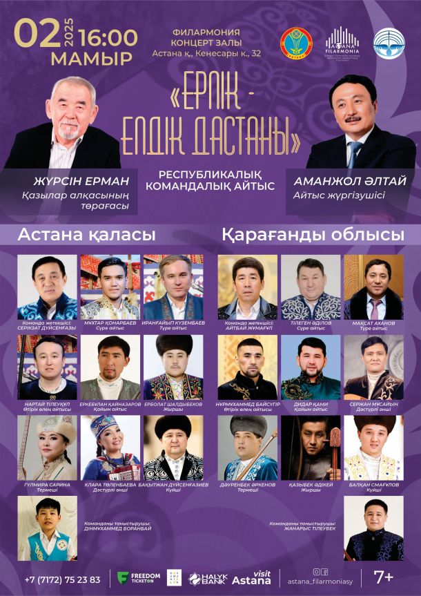 Еркеғали Рахмадиев атындағы Мемлекеттік академиялық филармонияның концерт залында "Ерлік-Елдік дастаны" атты командалық айтыстың жартылай финалы өтеді. Бұл жолы Астана мен Қарағанды қалаларының айтыскерлері өнер бәсекесінде бас қосады.«Ерлік. Елдік дастаны» — дәстүрлі айтысты жаңа форматта ұсынатын ерекше жоба. Мұнда тек суырыпсалма айтыс қана емес, ән, жыр, күй, терме өнерлері тоғысып, көрерменге ұлттық рух пен рухани нәр сыйлайды. Ақындар ерлік пен елдік ұғымдарын дәріптеп, тарихи сана мен ұлт болмысын жырға қосады.