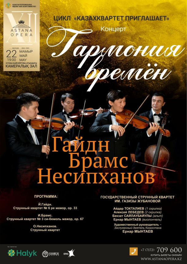 22 мая 2025 года в 19:00 в Камерном зале имени Куляш Байсеитовой (Astana Opera) в рамках цикла «Казахквартет приглашает» состоится концерт «Гармония времён».