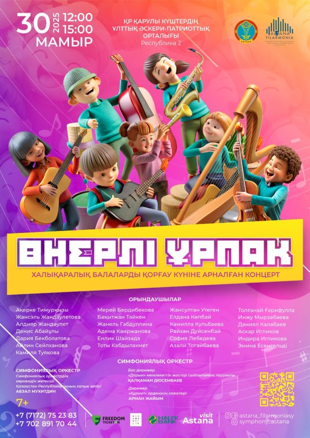 2025 жылғы 30 мамыр күні сағат 12:00 және 15:00-де Қазақстан Республикасы Қарулы Күштерінің Ұлттық әскери-патриоттық орталығында (Республика даңғылы, 2) Халықаралық балаларды қорғау күніне арналған «Өнерлі ұрпақ» атты мерекелік концерт өтеді.