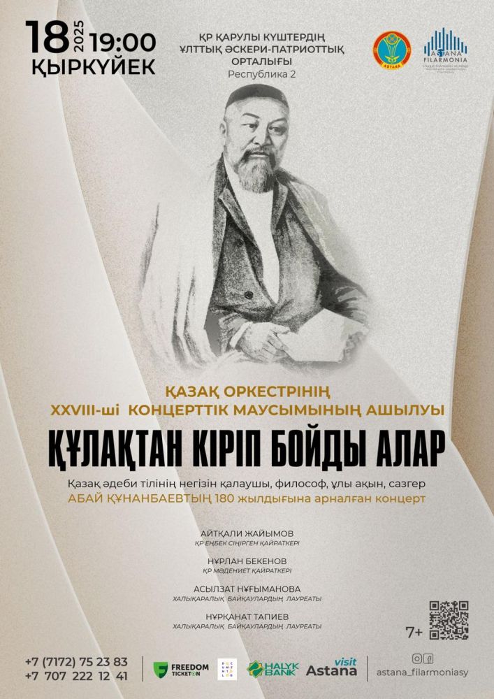 Еркеғали Рахмадиев атындағы Мемлекеттік академиялық филармониясының Қазақ оркестрі жаңа маусымының шымылдығын “Құлақтан кіріп бойды алар” атты ерекше концертпен ашады. Бұл кеш қазақтың ұлы ойшылы,ақын,философ, композитор, қазақ әдеби тілінің негізін қалаушы Абай Құнанбайұлының 180 жылдығына арналады.
